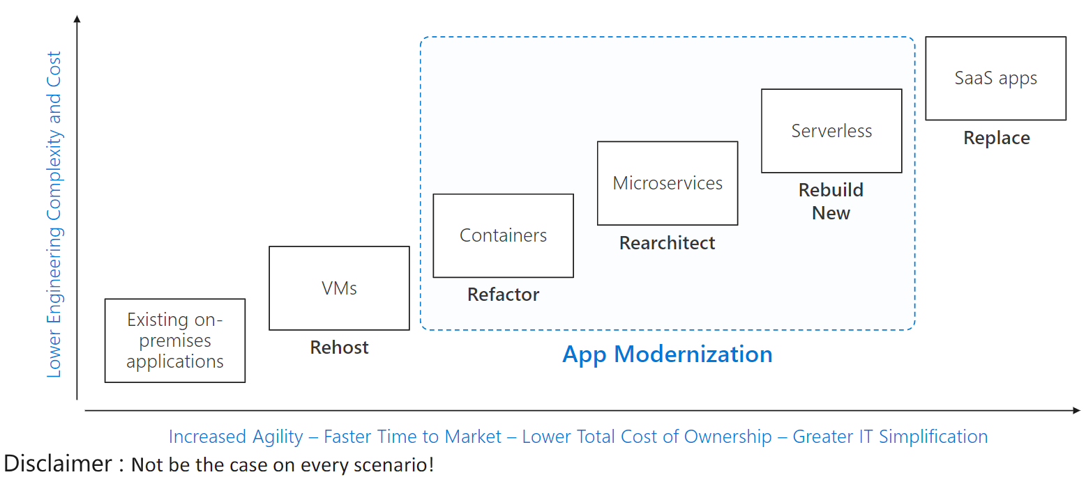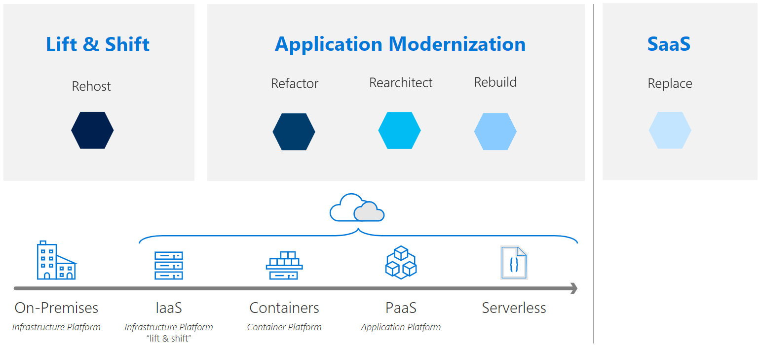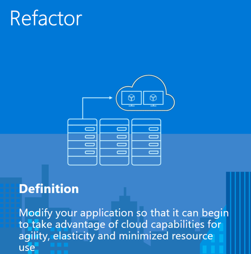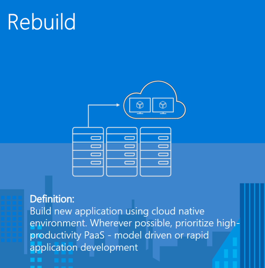 | Rehost | Refactor | Rearchitect | Re-build | Replace | ||||