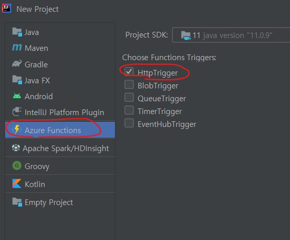 • New Project로 Azure Functions를 찾고, HttpTrigger를 선택합니다.