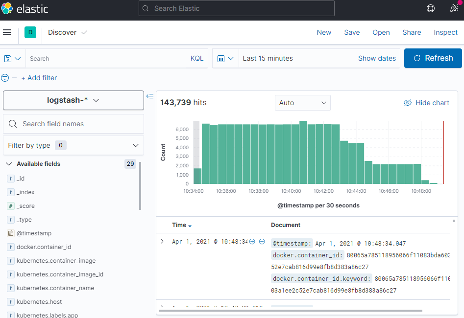sansae@win10pro-worksp:/workspaces$ cd elastic sansae@win10pro-worksp:/workspaces/elastic$ sansae@win10pro-worksp:/workspaces/elastic$ vi kibana/values.yaml ========================================================= imageTag: "7.12.0" ========================================================= sansae@win10pro-worksp:/workspaces/elastic$ helm install kibana/ --generate-name -n monitor-efk NAME: kibana-1617190735 LAST DEPLOYED: Wed Mar 31 20:38:57 2021 NAMESPACE: monitor-efk STATUS: deployed REVISION: 1 TEST SUITE: None sansae@win10pro-worksp:/workspaces/elastic$ kubectl get pod -n monitor-efk NAME READY STATUS RESTARTS AGE elasticsearch-master-0 1/1 Running 0 15h elasticsearch-master-1 1/1 Running 0 15h elasticsearch-master-2 1/1 Running 0 15h fluentd-1617190066-9g8n8 1/1 Running 2 14h fluentd-1617190066-9vnjh 1/1 Running 3 14h fluentd-1617190066-ccmth 1/1 Running 8 14h fluentd-1617190066-kfr96 1/1 Running 2 14h fluentd-1617190066-kxtmh 1/1 Running 6 14h fluentd-1617190066-n4566 1/1 Running 6 14h fluentd-1617190066-n77b8 1/1 Running 4 14h fluentd-1617190066-nxxq5 1/1 Running 2 14h fluentd-1617190066-v4dp9 1/1 Running 2 14h fluentd-1617190066-x4l6g 1/1 Running 6 14h kibana-1617190735-kibana-77f8f5b8c8-zxt8b 1/1 Running 0 14h