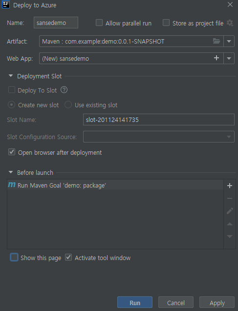 - 프로젝트 → Azure → Deploy to Azure Web Apps를 선택합니다.