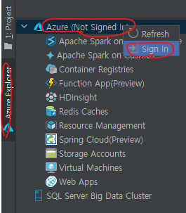 - Azure Explorer를 선택하고, Azure → Sign in을 선택합니다.