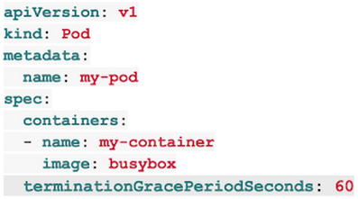 포드가 일반적으로 종료되는 데 30 초 이상 걸리는 경우 유예 기간을 늘려야합니다. Pod YAML에서 terminateGracePeriodSeconds 옵션을 설정하여이를 수행 할 수 있습니다. 예를 들어 60 초로 변경하려면 :