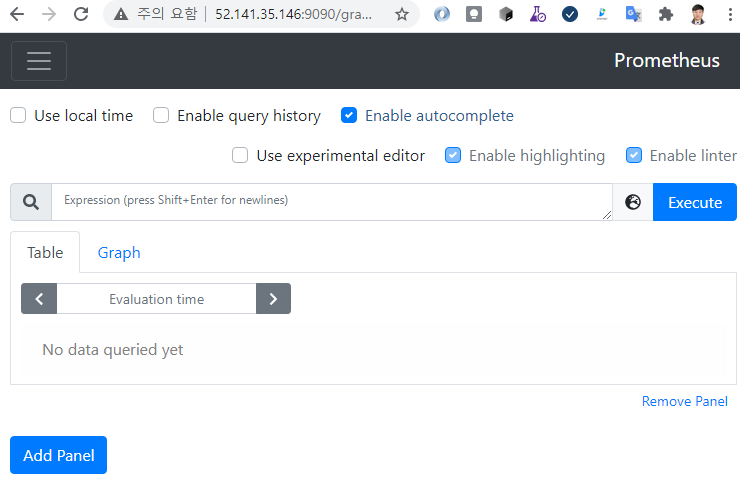 sansae@sansaeubuntu:~$ docker run --name prometheus -d -p 9090:9090 prom/prometheus Unable to find image 'prom/prometheus:latest' locally latest: Pulling from prom/prometheus e5d9363303dd: Pull complete 3430c2c42129: Pull complete 7631b5d56c90: Pull complete 343e06690c48: Pull complete dc32e90574e9: Pull complete a6d5d01cd646: Pull complete 832428480103: Pull complete 83e775ff1768: Pull complete 1ec97f567836: Pull complete 0cdf5b797911: Pull complete eb7d1f2acc9f: Pull complete 541ffe559bd5: Pull complete Digest: sha256:38d40a760569b1c5aec4a36e8a7f11e86299e9191b9233672a5d41296d8fa74e Status: Downloaded newer image for prom/prometheus:latest b9d0d4f676ba5f691596369675cf8adcf773a785dada9026fac295bb3cfa6300 sansae@sansaeubuntu:~$ curl ifconfig.me 52.141.35.146